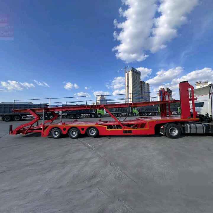 3 ஆக்சில் 8 கார் கேரியர் கன்டெய்னர் லோட் செமி டிரெய்லர் வலுவான ஏற்றுதல் திறன்: செமி டிரெய்லர் உகந்த இயந்திர அமைப்புடன் வடிவமைக்கப்பட்டுள்ளது, அதிகபட்ச ஏற்றுதல் திறன் 40 டன்களுக்கு மேல் அடையலாம், இது பல்வேறு கனரக கார்கள் மற்றும் எஸ்யூவிகளின் போக்குவரத்து தேவைகளை எளிதில் சமாளிக்கும். ;அதிக நிலைப்புத்தன்மையுடன்: இது மேம்பட்ட ஏர் சஸ்பென்ஷன் அமைப்பை ஏற்றுக்கொள்கிறது, இது சாலை நிலைமைகளுக்கு ஏற்ப உடலின் உயரத்தை தானாக சரிசெய்து சீராக இருப்பதை உறுதிசெய்யும். வாகனம் ஓட்டுதல் மற்றும் சரக்கு சேதத்தின் அபாயத்தை குறைக்கிறது. இதற்கிடையில், இது ஏபிஎஸ் எதிர்ப்பு பூட்டு பிரேக்கிங் சிஸ்டம் மற்றும் ஈஎஸ்பி எலக்ட்ரானிக் ஸ்டெபிலிட்டி புரோகிராம் ஆகியவை டிரைவிங் பாதுகாப்பை மேலும் மேம்படுத்துகிறது; நெகிழ்வான சூழ்ச்சியுடன்: திசைமாற்றி அமைப்பு கவனமாக டியூன் செய்யப்பட்டுள்ளது; ஆற்றல் சேமிப்பு மற்றும் சுற்றுச்சூழல் பாதுகாப்பு: குறைந்த காற்று எதிர்ப்பு வடிவமைப்பு மற்றும் இலகுரக பொருட்களின் பயன்பாடு ஆற்றல் நுகர்வு திறம்பட குறைக்கிறது.