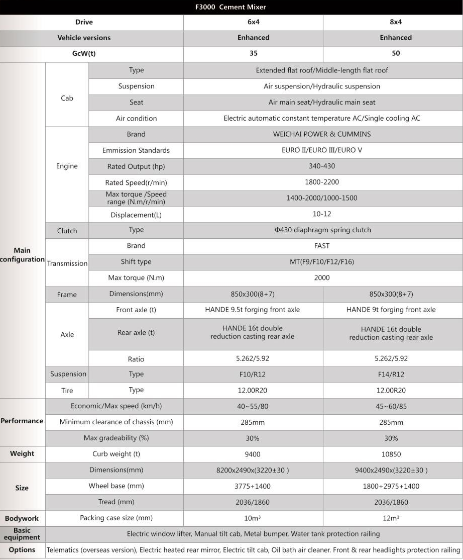 சேஸ் மற்றும் பவர் சிஸ்டம்: ஷாக்மேன் எஃப் 3000 6 எக்ஸ் 4 & 8 எக்ஸ் 4 சிமென்ட் மிக்சர் டிரக் வீச்சாய் எஞ்சினை ஏற்றுக்கொள்கிறது, இது வலுவான சக்தி, அதிக முறுக்கு மற்றும் நல்ல முடுக்கம் செயல்திறனைக் கொண்டுள்ளது. கட்டுமான தளத்தில் சிக்கலான சாலை நிலைமைகளின் கீழ் டிரக்கின் கடக்கத்தன்மை மற்றும் ஸ்திரத்தன்மையை உறுதிப்படுத்த விரைவான பரிமாற்றம் மற்றும் மேன் அச்சுடன் பொருந்துகிறது.