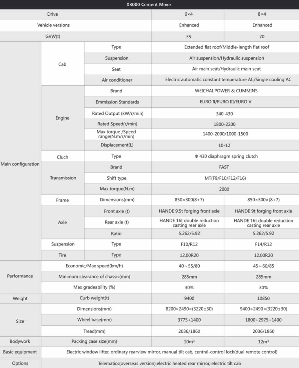 ஷாக்மேன் எக்ஸ் 3000 மிக்சர் டிரக் என்பது கான்கிரீட் போக்குவரத்துக்காக வடிவமைக்கப்பட்ட ஒரு திறமையான பொறியியல் வாகனம் ஆகும். இது ஷாக்மேன் கனரக லாரிகளின் நம்பகத்தன்மையை தொழில்முறை மேல் வாகன உற்பத்தி நுட்பங்களுடன் ஒருங்கிணைக்கிறது. கலவை தொட்டி அதிக வலிமை கொண்ட உடைகள்-எதிர்ப்பு எஃகு தகடுகளால் ஆனது மற்றும் பொதுவாக 8-12 கன மீட்டர் அளவைக் கொண்டுள்ளது. உட்புற சுவர் இரட்டை ஹெலிகல் பிளேடுகளுடன் பற்றவைக்கப்படுகிறது, போக்குவரத்தின் போது கான்கிரீட்டின் சீரான கலவையை உறுதி செய்கிறது மற்றும் பிரித்தல் அல்லது திடப்படுத்துவதைத் தடுக்கிறது. தொட்டி ஒரு ஹைட்ராலிக் மோட்டார் மூலம் இயக்கப்படுகிறது மற்றும் அதிக பரிமாற்ற திறன் மற்றும் மென்மையான செயல்பாட்டிற்காக இறக்குமதி செய்யப்பட்ட குறைப்பாளருடன் இணைக்கப்பட்டுள்ளது. இது முன்னோக்கி மற்றும் தலைகீழ் வெளியேற்றத்தை ஆதரிக்கிறது, மீதமுள்ள விகிதத்துடன் 1%க்கும் குறைவாக உள்ளது.
